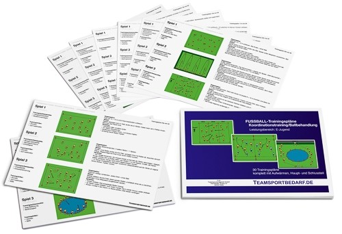 Sie erhalten 30 komplette Fussball-Trainingspläne, mit insgesamt 90 Trainingsübungen, auf hochwertigem Papier, in DIN A4 Grösse. Schwerpunkt: Koordinationstraining (Fussball) für Bambini und F-Jugend. Jeder der 30 Trainingspläne ist unterteilt in Aufwärmübung, Haupttrainingseinheit und Schlussteil. Somit erhalten sie 30 komplette Trainingspläne mit insgesamt 90 Trainingseinheiten. Die Übungen in den Trainingsplänen sind nicht identisch mit den Übungen in unseren Kartotheken, es sind komplett neue und eigenständige Einheiten. Diese innovativen Trainingpläne sind nicht im Handel erhältlich, sondern nur bei uns. Wir haben diese Pläne zusammen mit einem erfahrenen Fussball-Trainerteam verfasst und zusammengestellt. Es handelt sich um sehr verständlich aufgebaute Trainingseinheiten, kombiniert mit exzellent animierten Farbgrafiken.Einige deutsche Profivereine arbeiten bereits mit unseren Trainingsmaterialien.